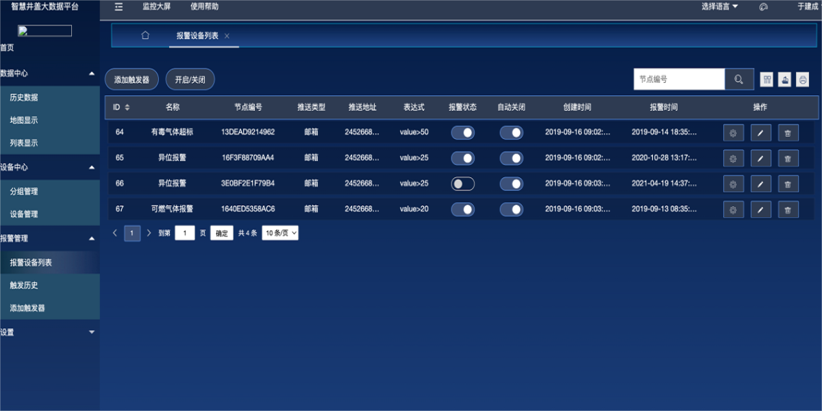 產(chǎn)品描述:智慧氣體監測安全云平臺以設備為核心,管理設備數據;支持多種設備傳輸協(xié)議,展示設備的實(shí)時(shí)數據和設備狀態(tài);可快捷靈活的設置設備告警規則,設備告警后可通過(guò)多種方式快速發(fā)送報警通知,讓用戶(hù)第一時(shí)間收到報警信息,快速做出應對;基于強大的數據管理,用戶(hù)可快捷方便的對本平臺的實(shí)時(shí)數據,歷史數據等進(jìn)行查看和分析,也支持通過(guò)設置第三方數據推送和openApi方式進(jìn)行平臺的應用擴展;